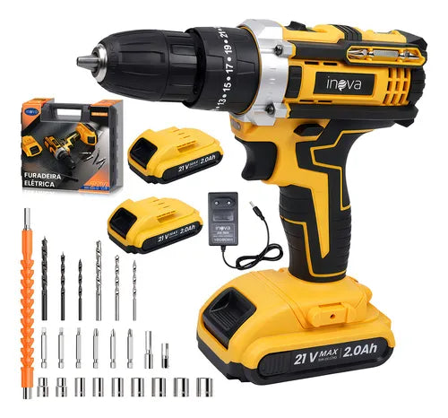 Parafusadeira furadeira de impacto profissional Inova com tecnologia sem fio e bateria recarregável de alta performance. Equipada com LED integrado para iluminação de precisão em ambientes com pouca luz. O kit completo inclui 2 baterias recarregáveis de longa duração, 27 acessórios variados e maleta resistente para transporte e armazenamento. Ideal para aplicações profissionais e domésticas, oferecendo versatilidade em furação, parafusamento e trabalhos de impacto. Construção robusta e ergonômica para conforto durante uso prolongado.